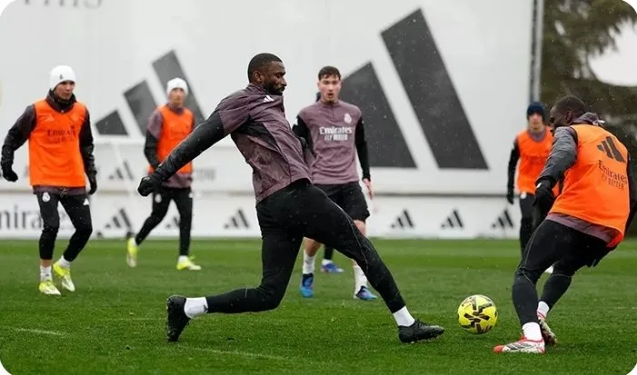 今天这皇家马德里队备战对阵瓦伦西亚比赛的第三次训练。米利唐和贝林厄姆继续进行各自的恢复性训练。罗德里戈在室内进行训练。吕迪格和门迪已恢复,正以与全队相同的节奏进行合练。